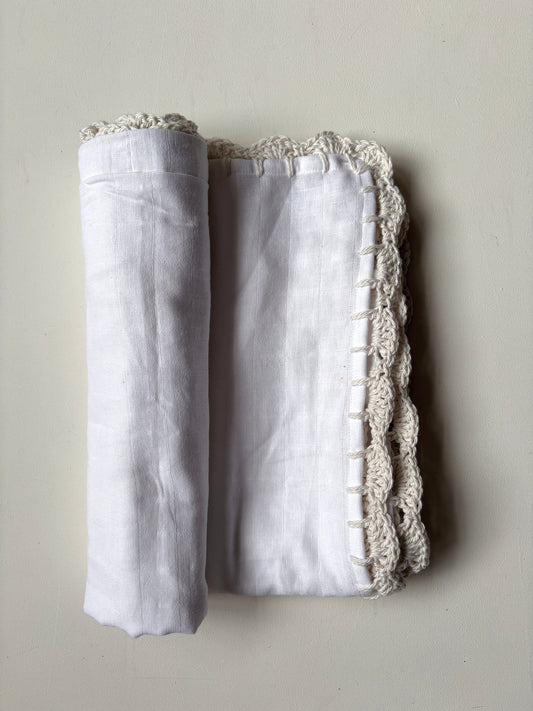 Organic cotton lightweight baby swaddle with crochet trim - The Florence Blanket