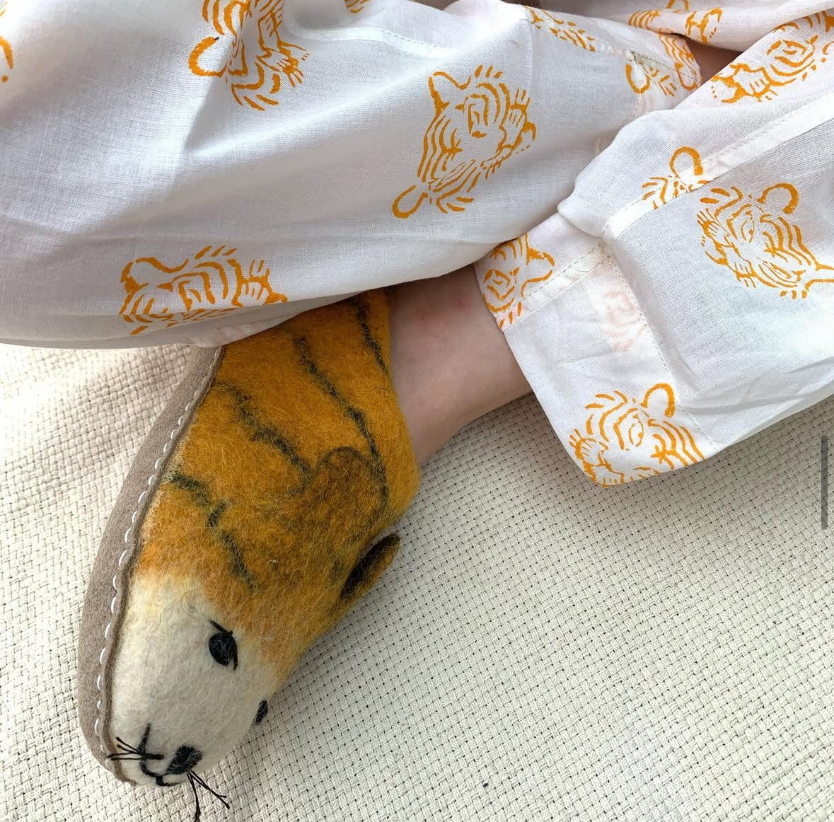 Beautiful handcrafted Tiger Block Print Pyjamas. Made in small batches in Ranthambhore, India, each pair is created using traditional hand block-printing techniques, celebrating centuries-old artistry while supporting skilled local crafts people.